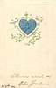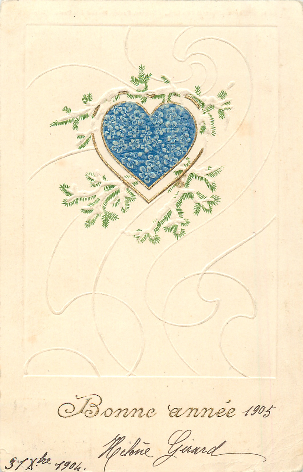 BONNE ANNEE, snowy evergreen round blue flower filled heart, embossed white design in background
