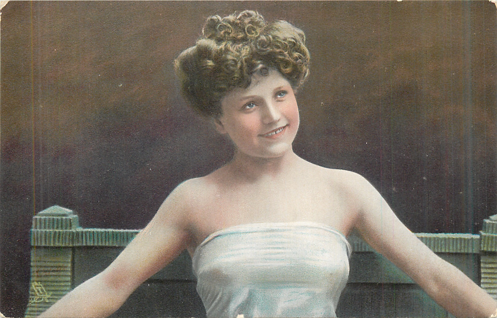 pretty girl seated with arms stretched out laterally, off shouler dress