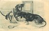two dachshunds, one in front laps up spilt milk from bowl, observed by dachsund behind