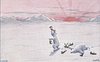 personised polar bear on hindlegs drinking from bottle, another passed out on snow, bottles around