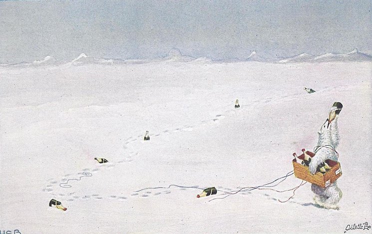 personised polar bear on hindlegs drinking from bottle walking front right carrying basket, many bottles on snow on snow