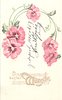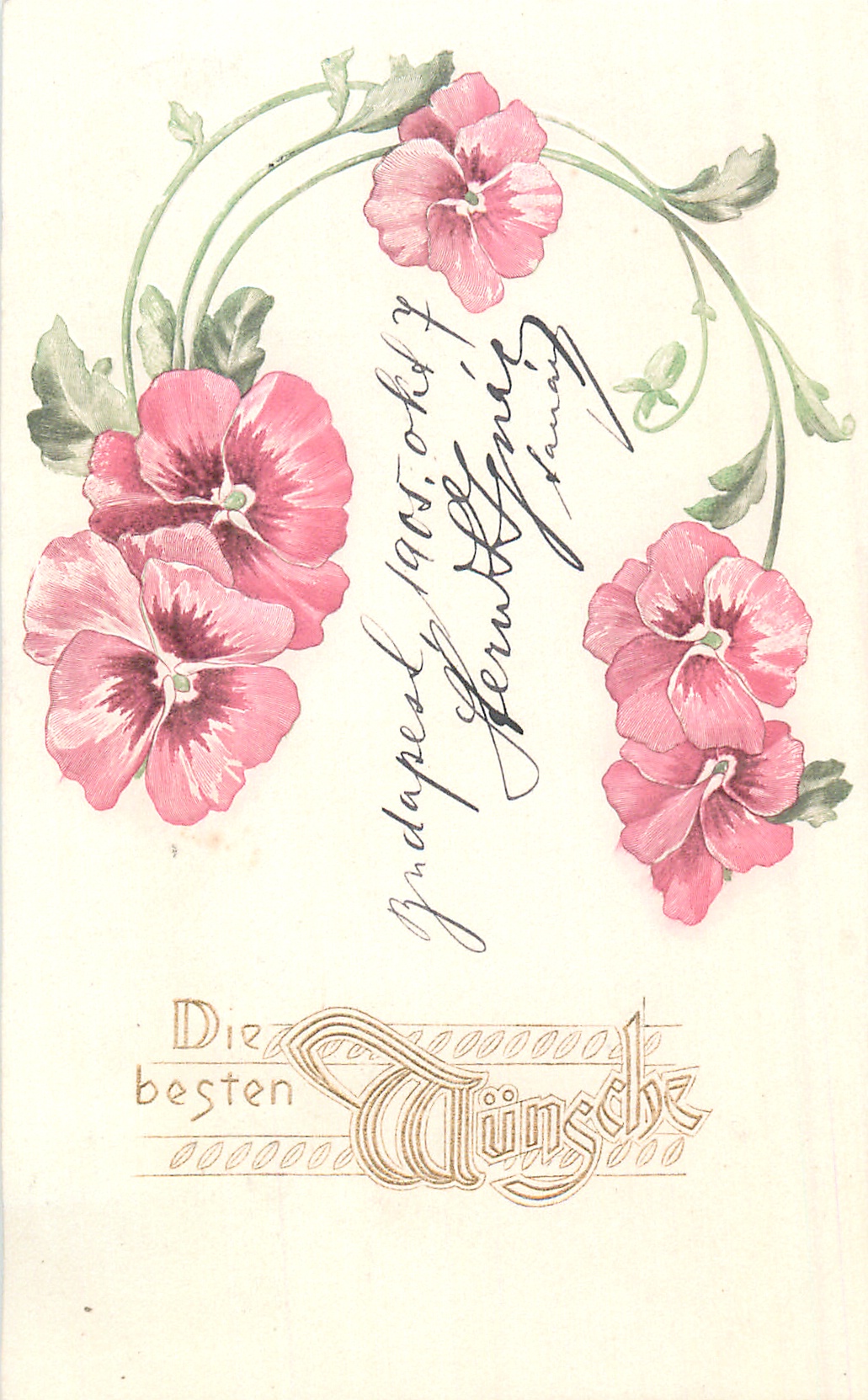 DIE BESTEN WUNSCHE in gilt below pink pansies, white background