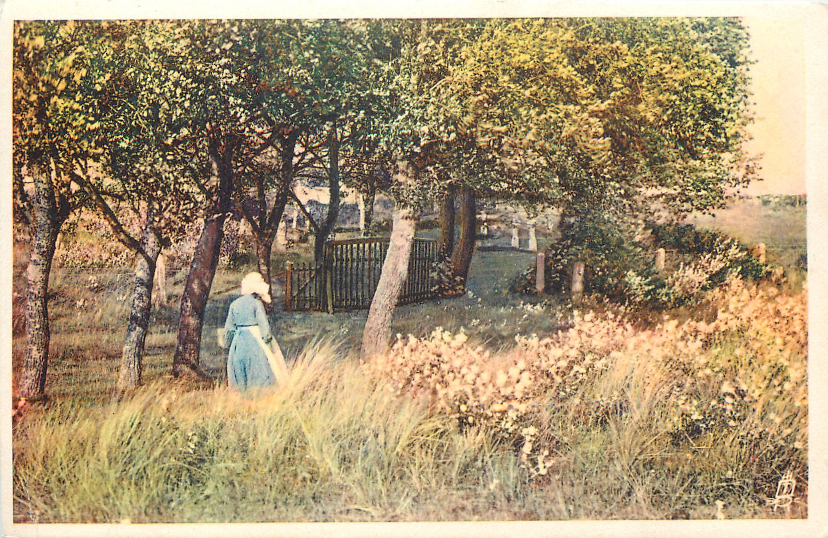 woman walking away right in field at edge of orchard, wild flowers right