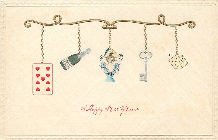 A HAPPY NEW YEAR tiny insets of 9 of hearts, champagne bottle, woman, key, dice all hanging in a line from gold support, cream background