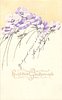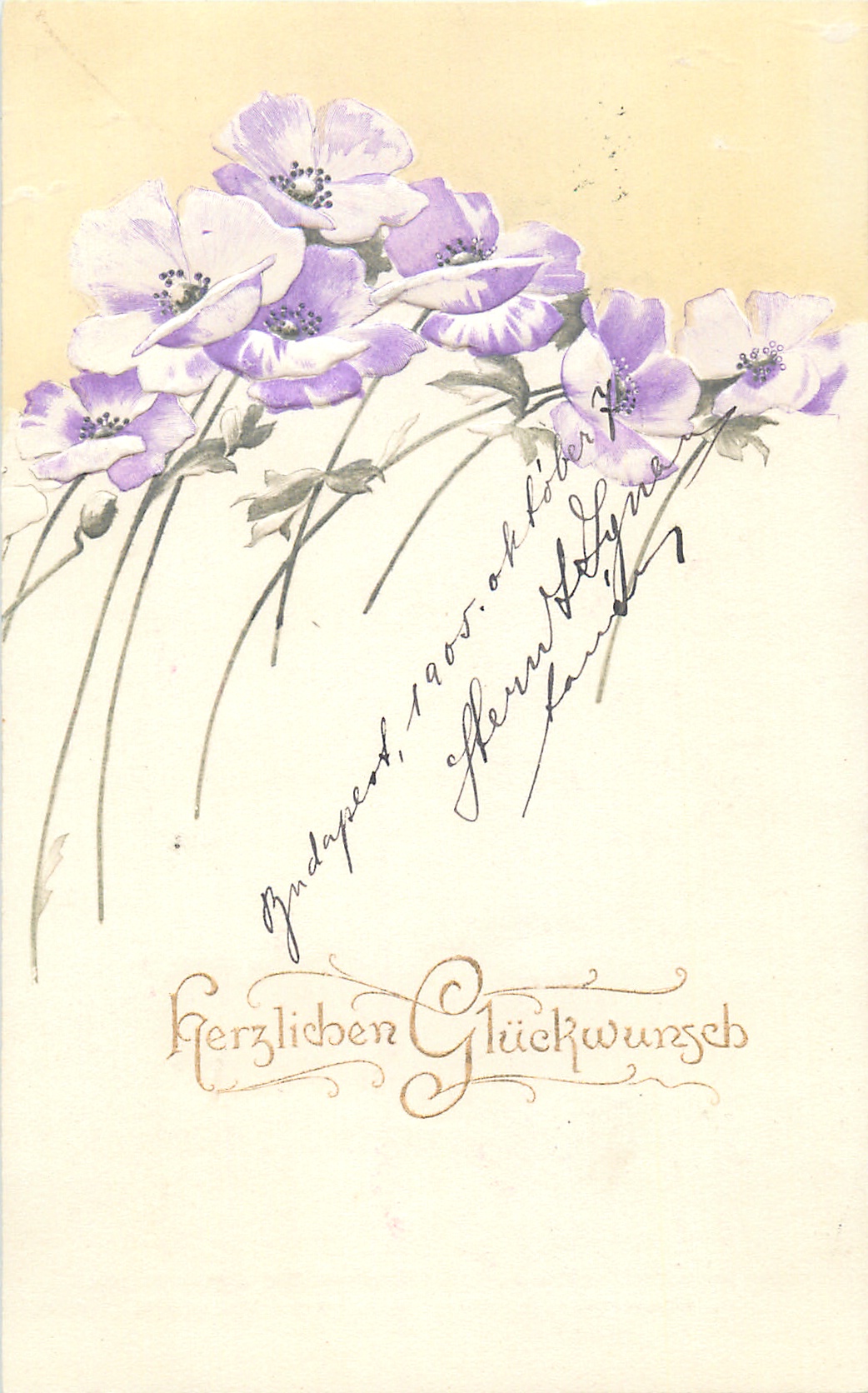 HERZLICHEN GLUCKWUNSCH in gilt below purple anemones, yellow background at top, white below