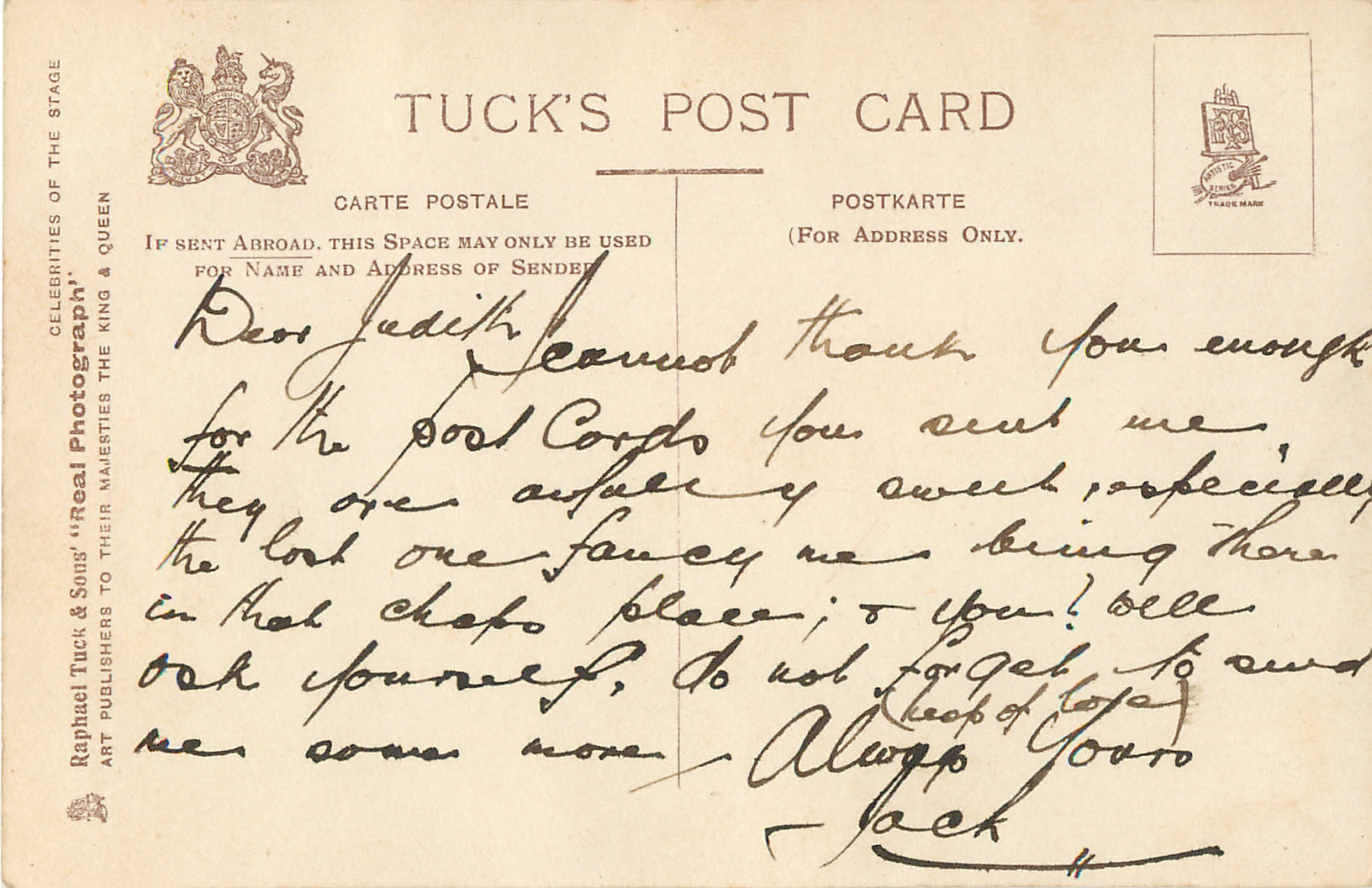 REAL PHOTOGRAPH, come hand coloured and with glitter. Cards in this set have prefix G and number on back or front of card. Cards with number and suffix G on front are recorded in set CELEBRITIES OF THE STAGE (i.n. 1000-1149G) .