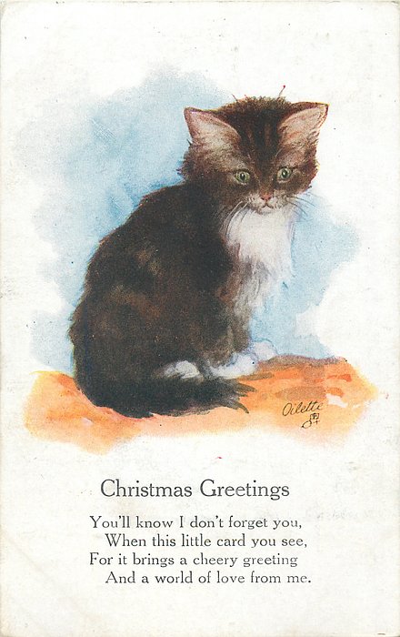 comes CHRISTMAS GREETINGS; YOU'LL I DON'T FORGET YOU, WHEN THIS LITTLE CARD YOU SEE, FOR IT BRINGS A CHEERY GREETING AND A WORLD OF LOVE FROM ME.