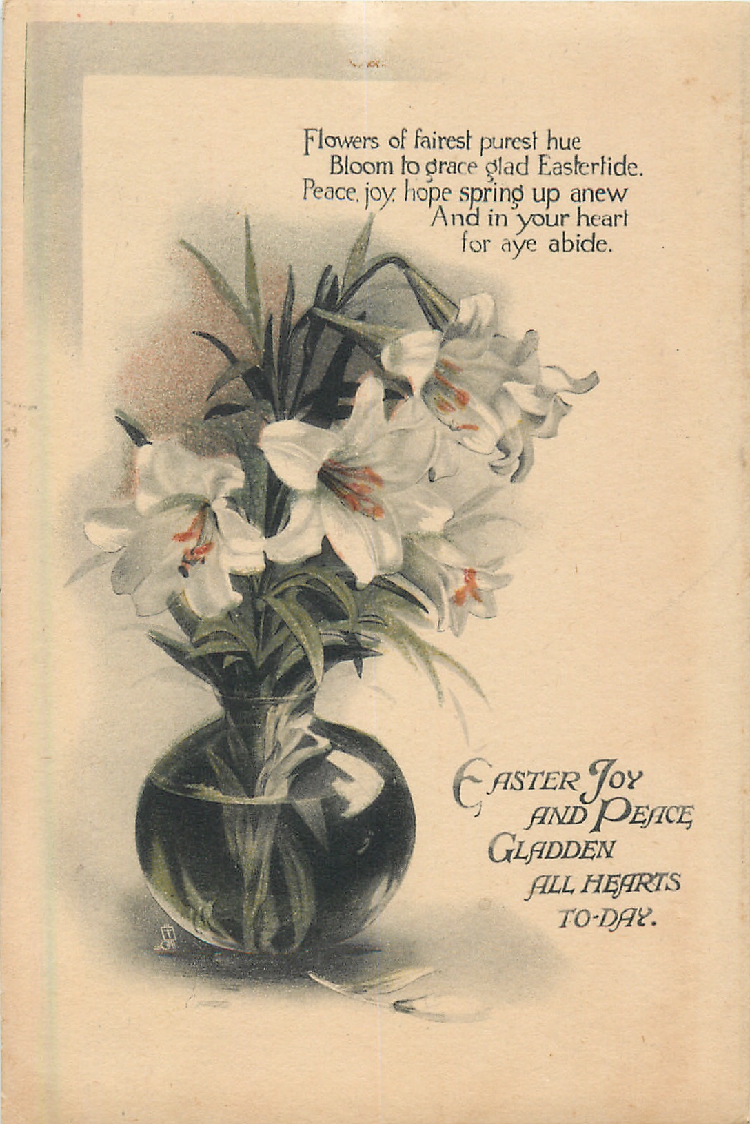 verse. front top:- FLOWERS OF FAIREST PUREST HUE BLOOM TO GRACE GLAD EASTERTIDE. PEACE, JOY, HOPE SPRING UP ANEW AND IN YOUR HEART FOR AYE ABIDE