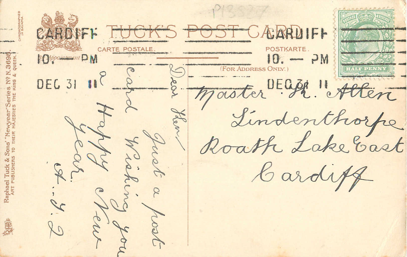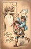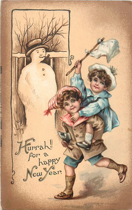 HURRAH! FOR A HAPPY NEW YEAR young boy carries girl piggy-back past snowman