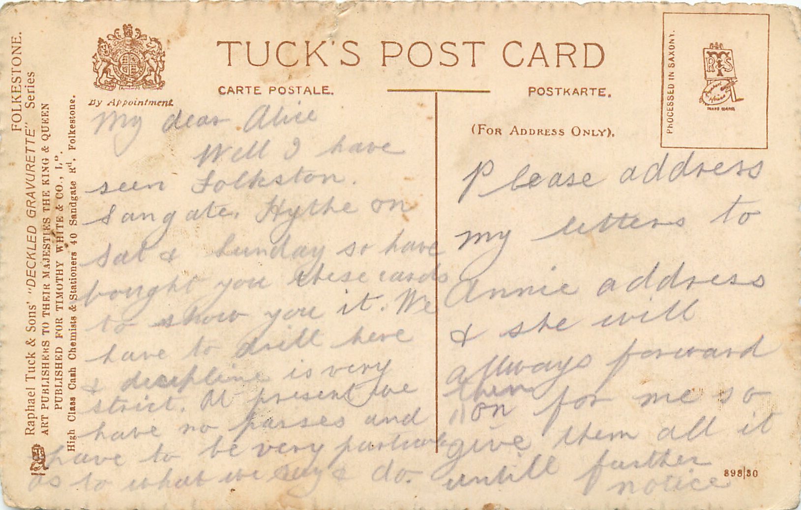 DECKLED GRAVURETTE, PROCESSED IN SAXONY (in stamp box), PUBLISHED FOR TIMOTHY WHITE & CO., LTD., HIGH CLASS CASH CHEMISTS & STATIONERS 40 SANDGATE RD. FOLKESTONE. DECKLED GRAVURETTE, back small numbers, appear not to be Tuck