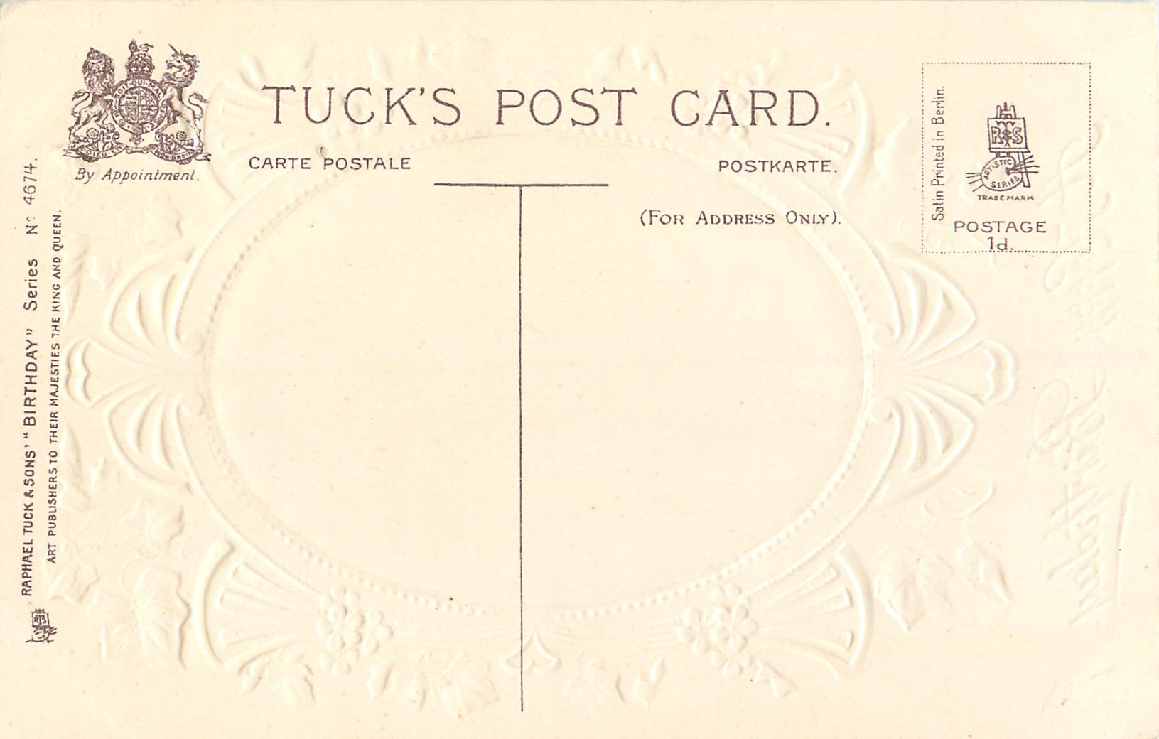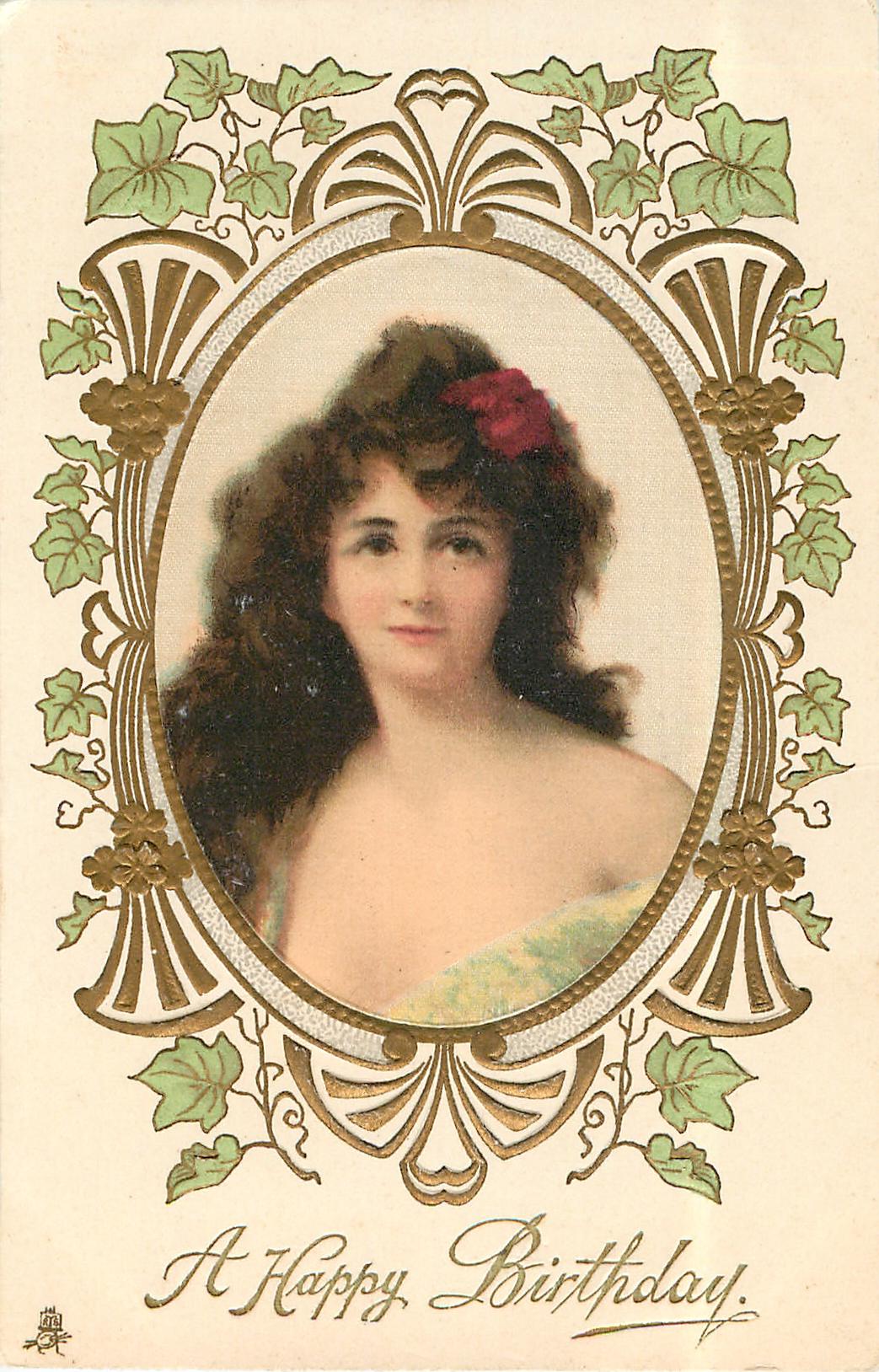 A HAPPY BIRTHDAY silk insert of Asti lady (Rosalind) facing front in ornate embossed nouveau borders