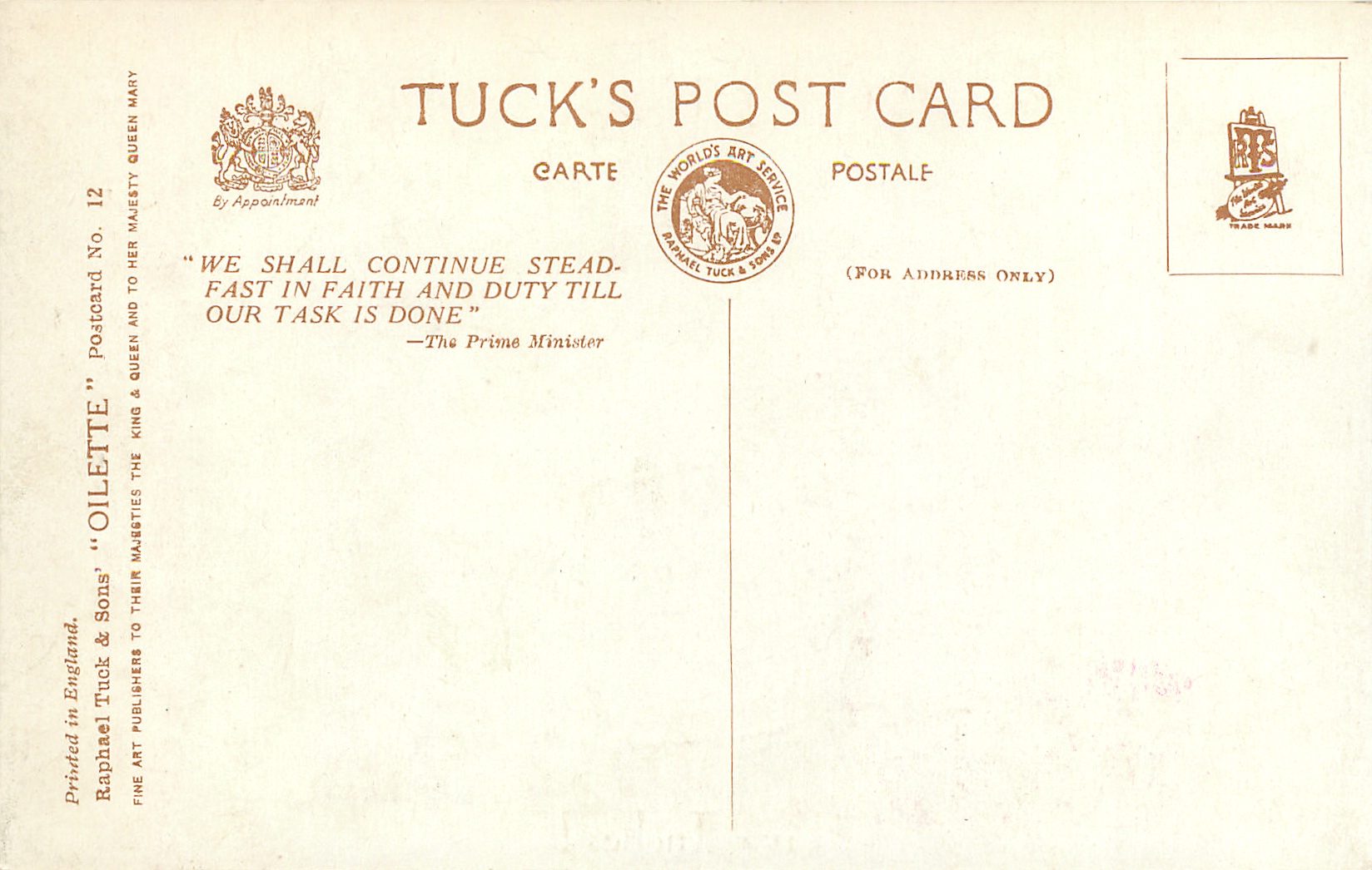 OILETTE, PRINTED IN ENGLAND, patriotic slogan on back, same image and title in set "comic children World War II period, unnumbered"