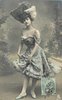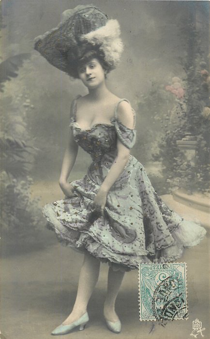 pretty brunette in off shoulder blue costume, skirt held up with both hands, faces half left, large hat