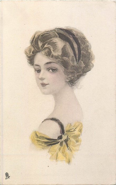 SEPIA MAIDENS head & shoulders study of brunette facing left looking half front, in yellow dress