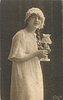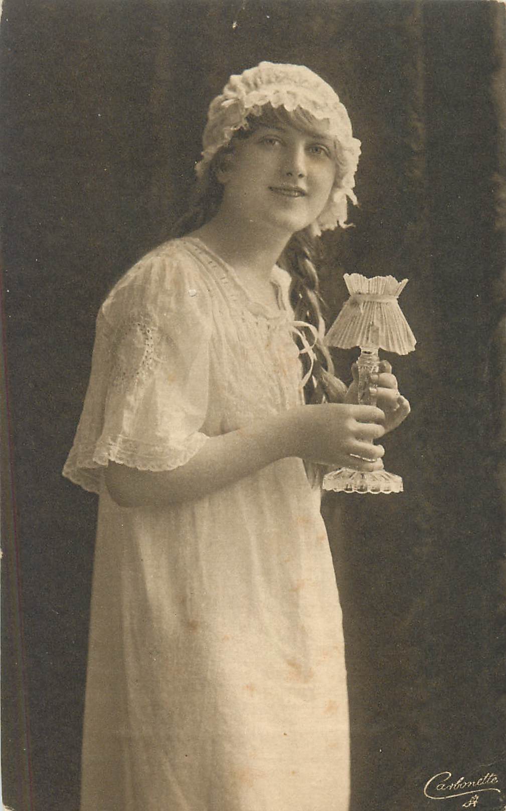 girl in nightgown & cap, poses with candle stick with both hands facing right looking front