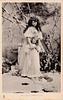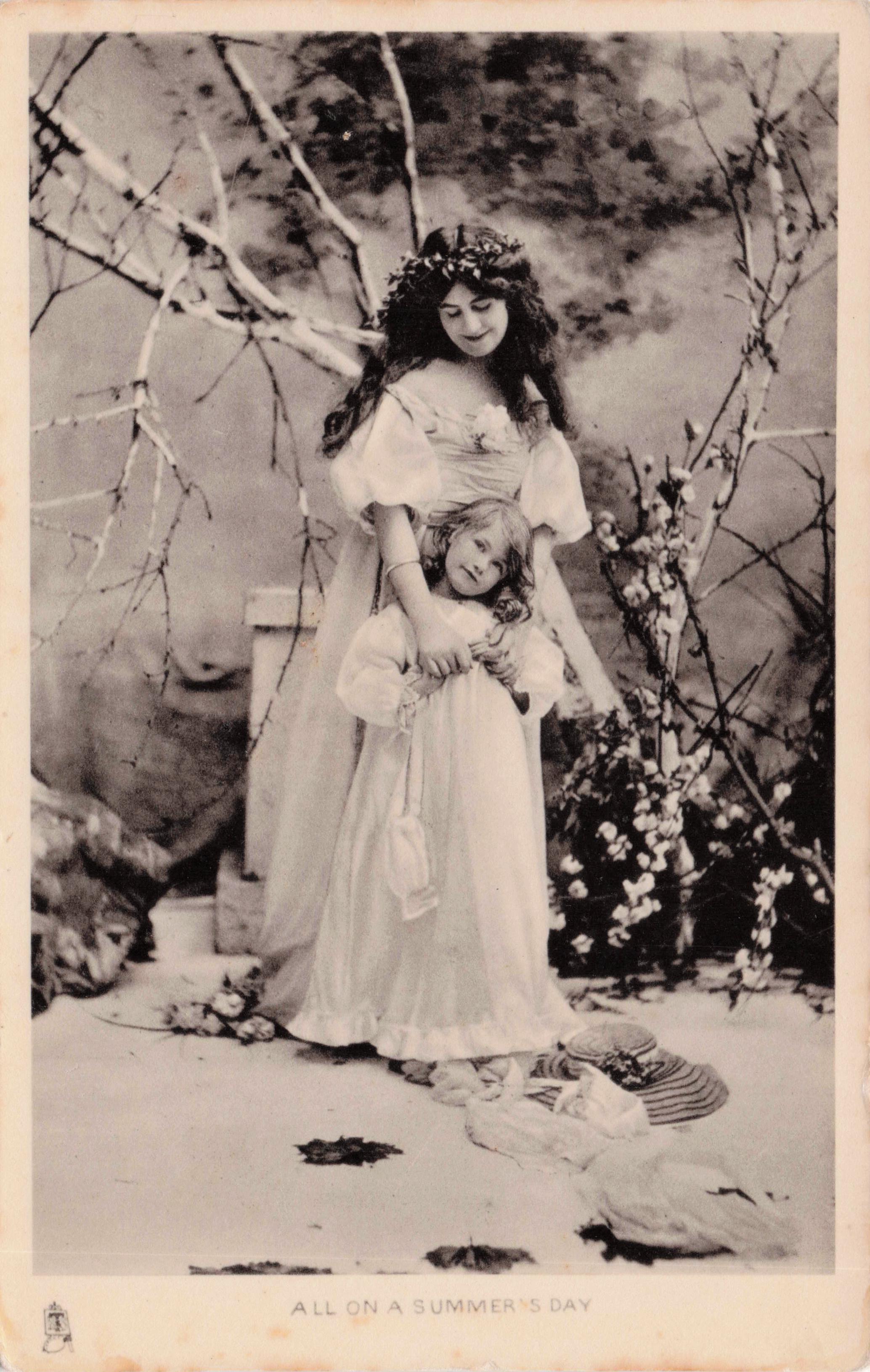 mother holds & looks down at daughter in front of her lboth wearing white dresses