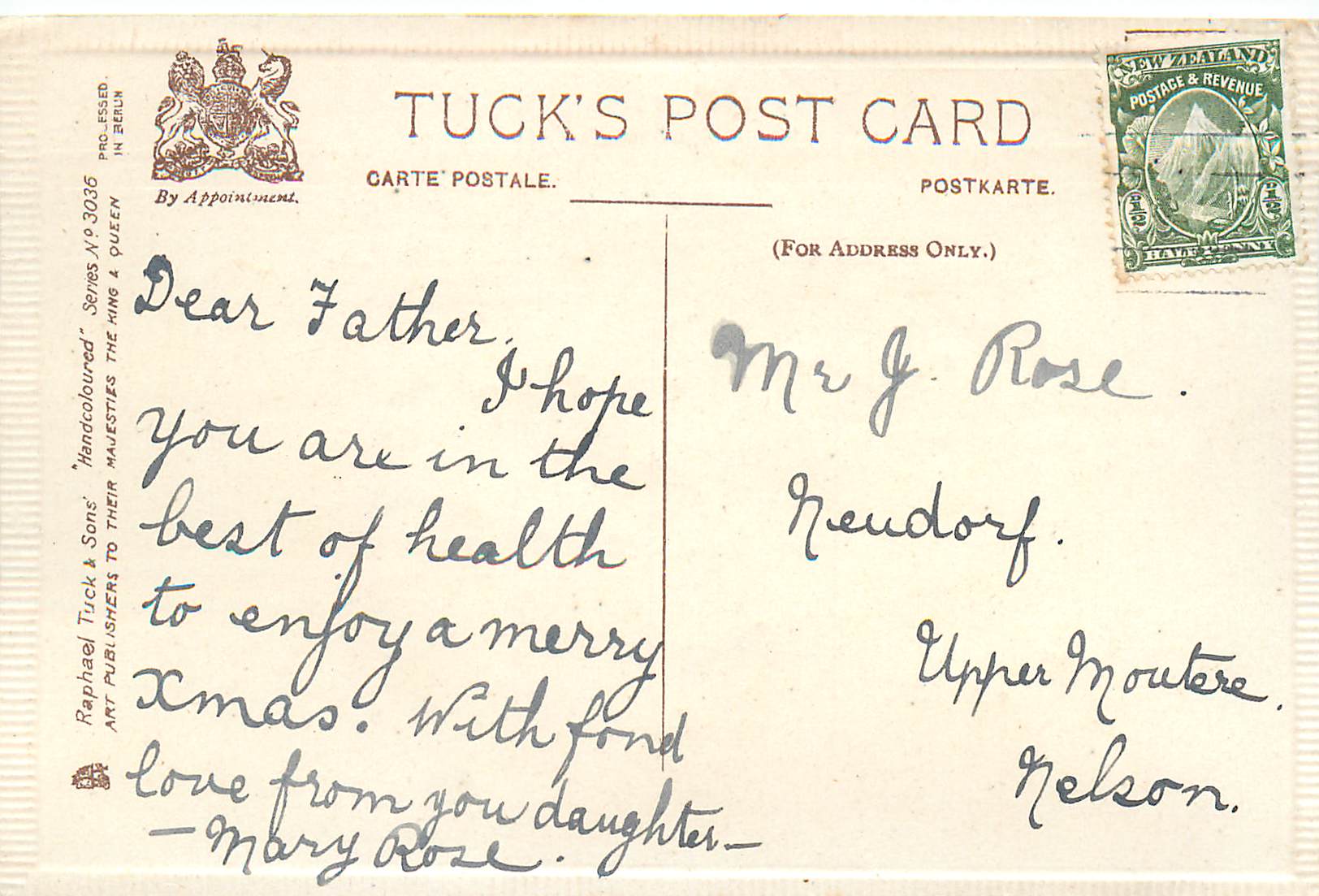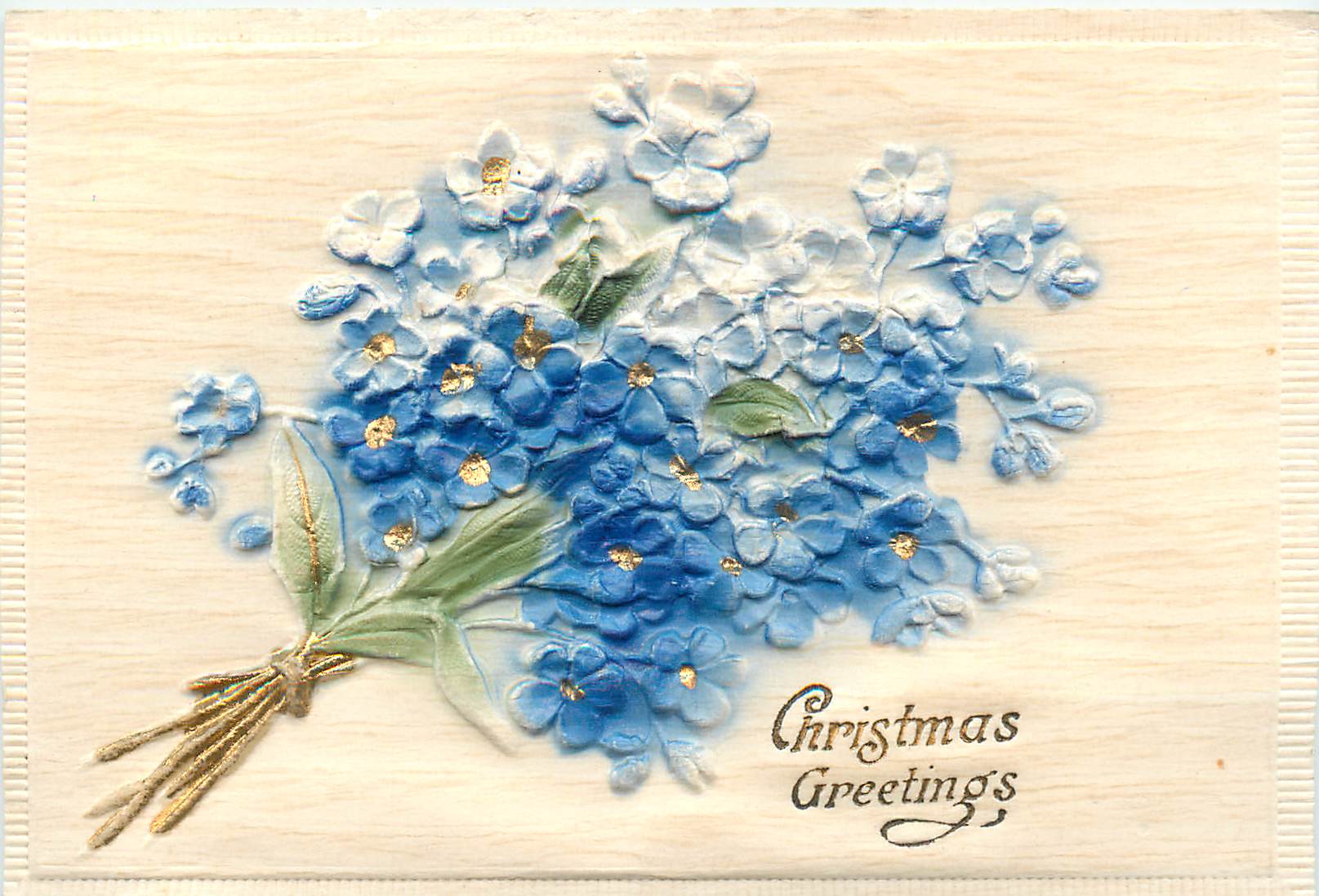 CHRISTMAS GREETINGS in gilt below large bunch of forget-me-nots