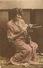 lady in Japanese dress sits on low stool, looking front, vase of flowers on her lap