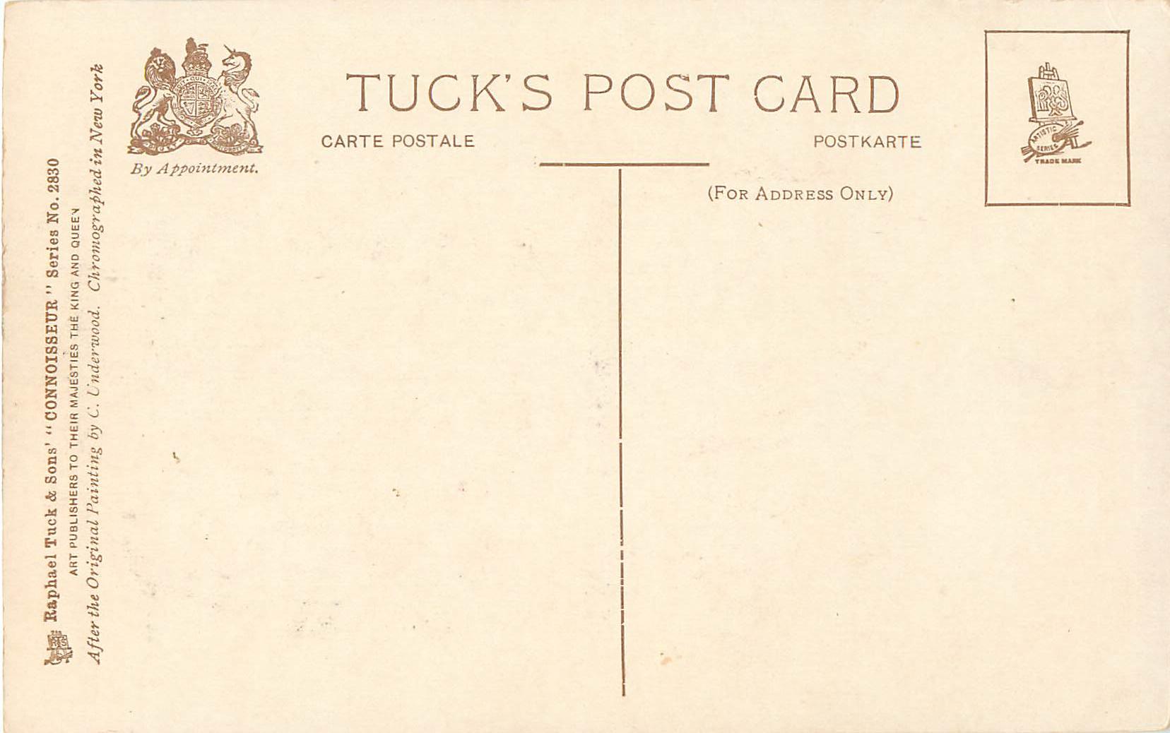 CONNOISSEUR, CHROMOGRAPHED IN NEW YORK, listed in 1911/1912 Postcard Catalogue, tuck error back inscription AFTER THE ORIGINAL PAINTING BY C. UNDERWOOD.,(likely Tuck artist error on back) not sold in U.S.A.