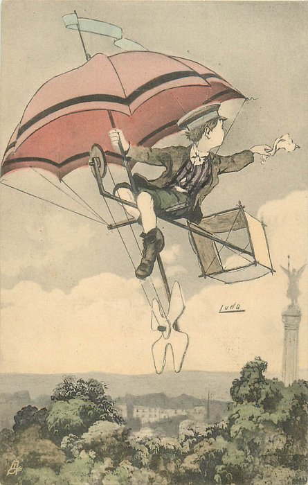 boy rides parasol propelled flying machine high over country & statue, he looks right waving cloth