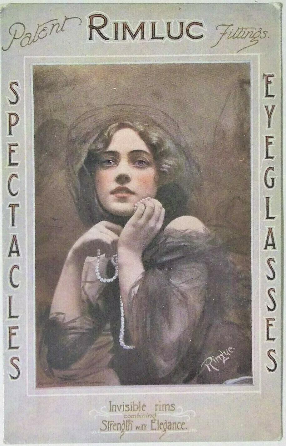 PATENT RIMLUC FITTINGS SPECTACLES EYEGLASSES, INVISIBLE RIMS STRENGTH WITH ELEGANCE, advertising card from F.J. BLUETT, LONDON