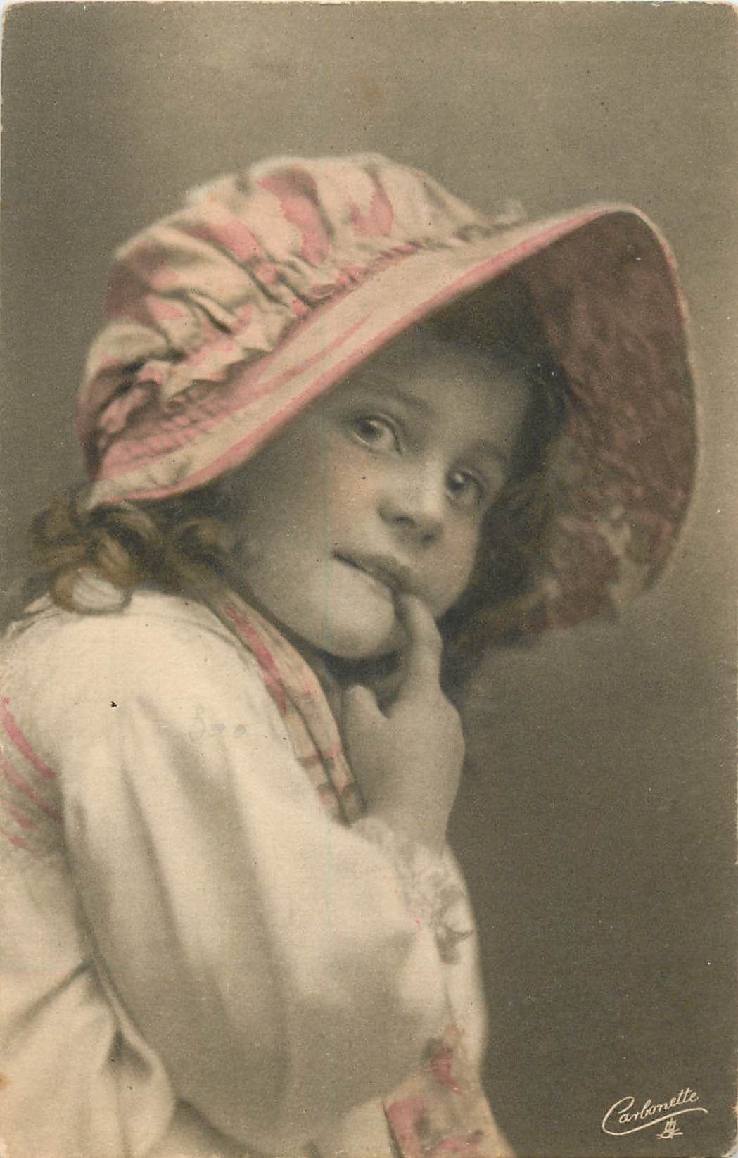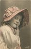 head & shoulders study of young girl with finger in mouth, faces right, finger in mouth, large hat