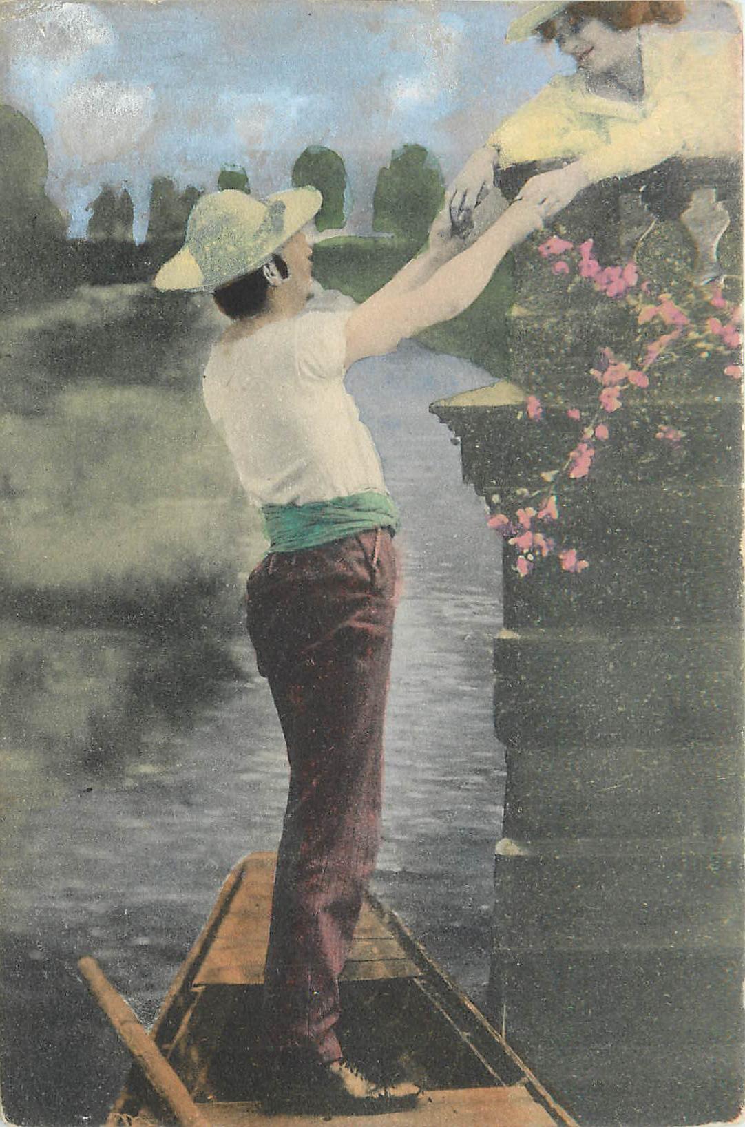 man standing at back of boat reaches with both hands to woman behind flowered wall