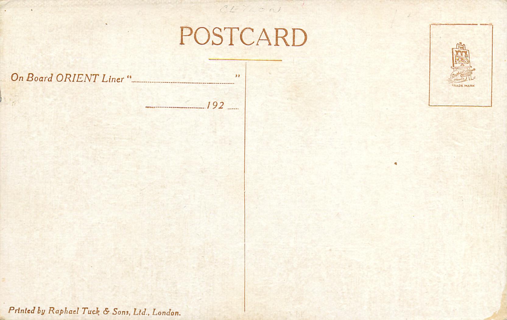 POSTCARD, ON BOARD ORIENT LINER "....." 192, PRODUCED BY RAPHAEL TUCK & SONS, LTD., LONDON, OILETTE on front, come with plain finish as series set 6, packet series number not on cards, same images various OILETTE COLOMBO sets,