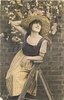 pretty girl in striped dress with large hat stands on stepladder in front of wall, leaning her left elbow on ladder top, holding hat on with right hand