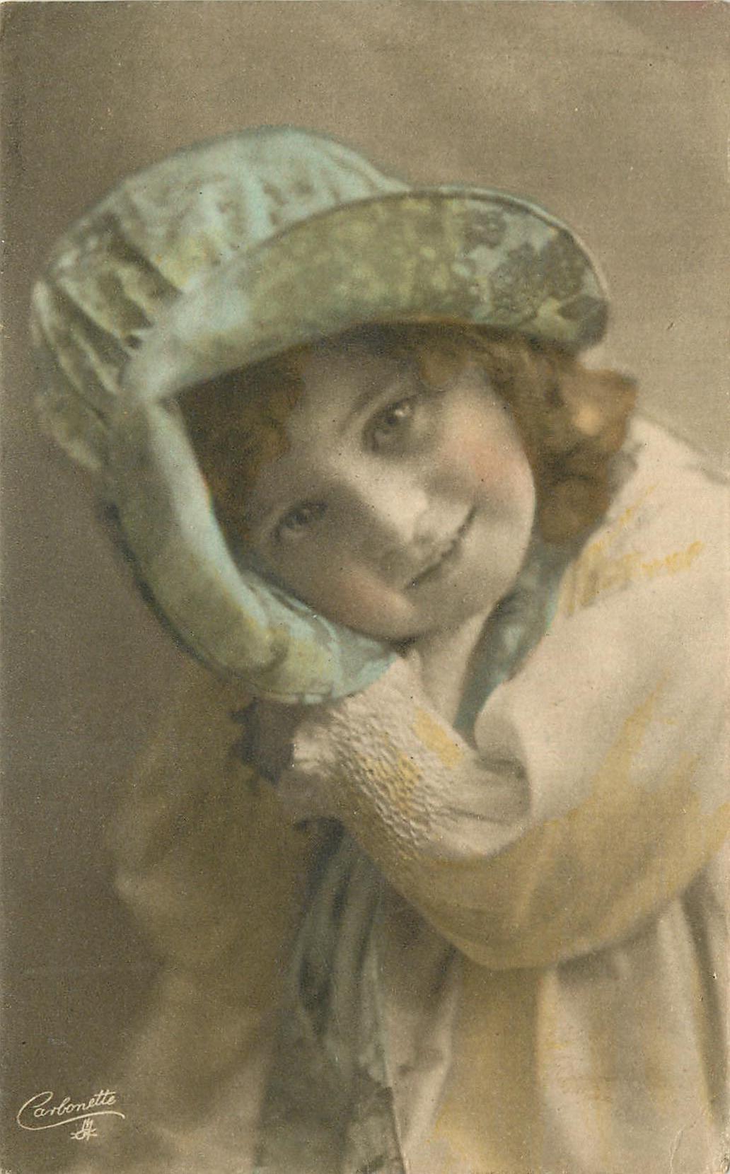 head & shoulders of a little girl in bonnet, head tilted to the left with hands under her cheek