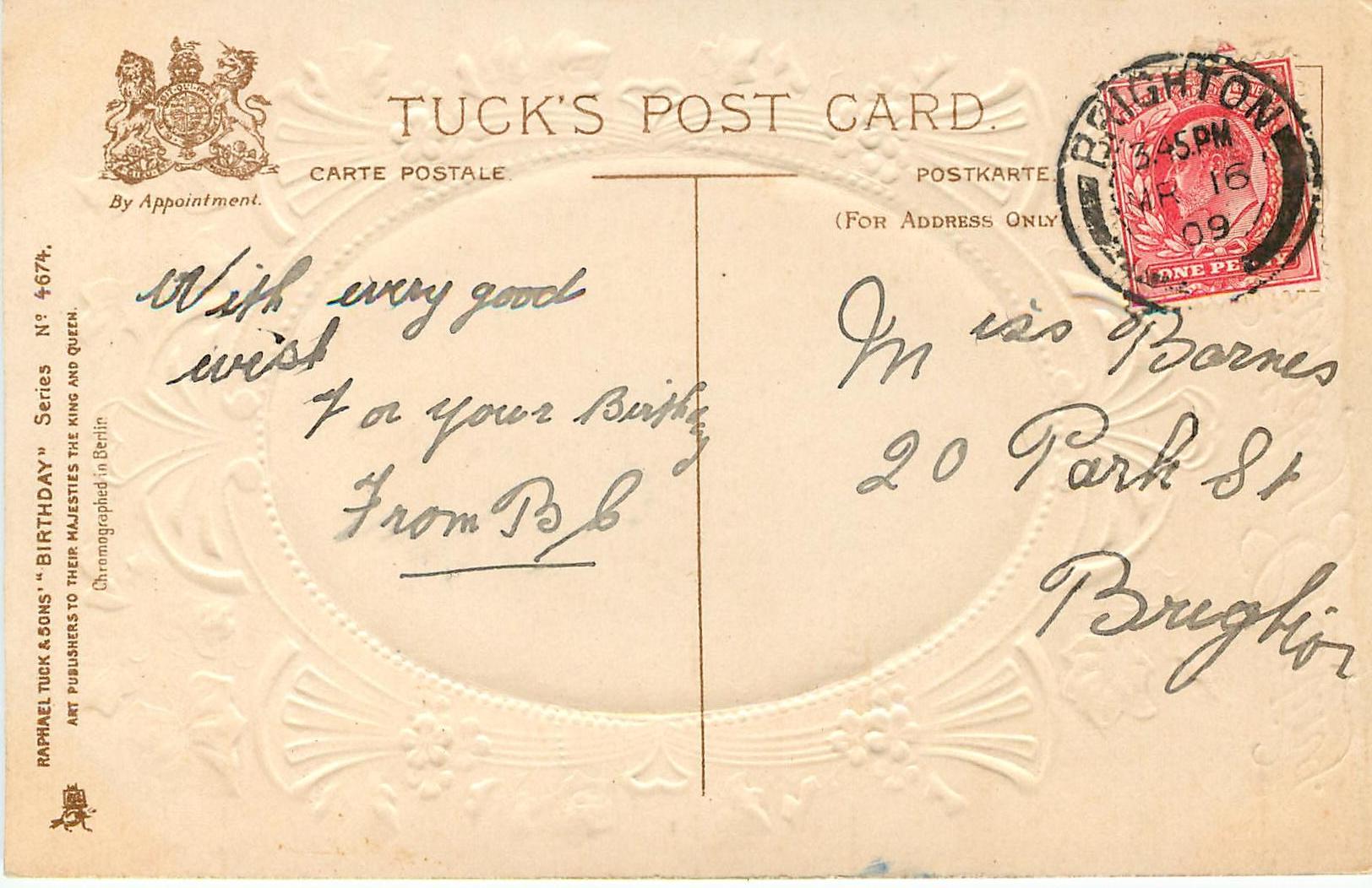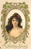 A BIRTHDAY GREETING, silk insert of Asti lady (Rosalind) facing front in ornate embossed nouveau borders