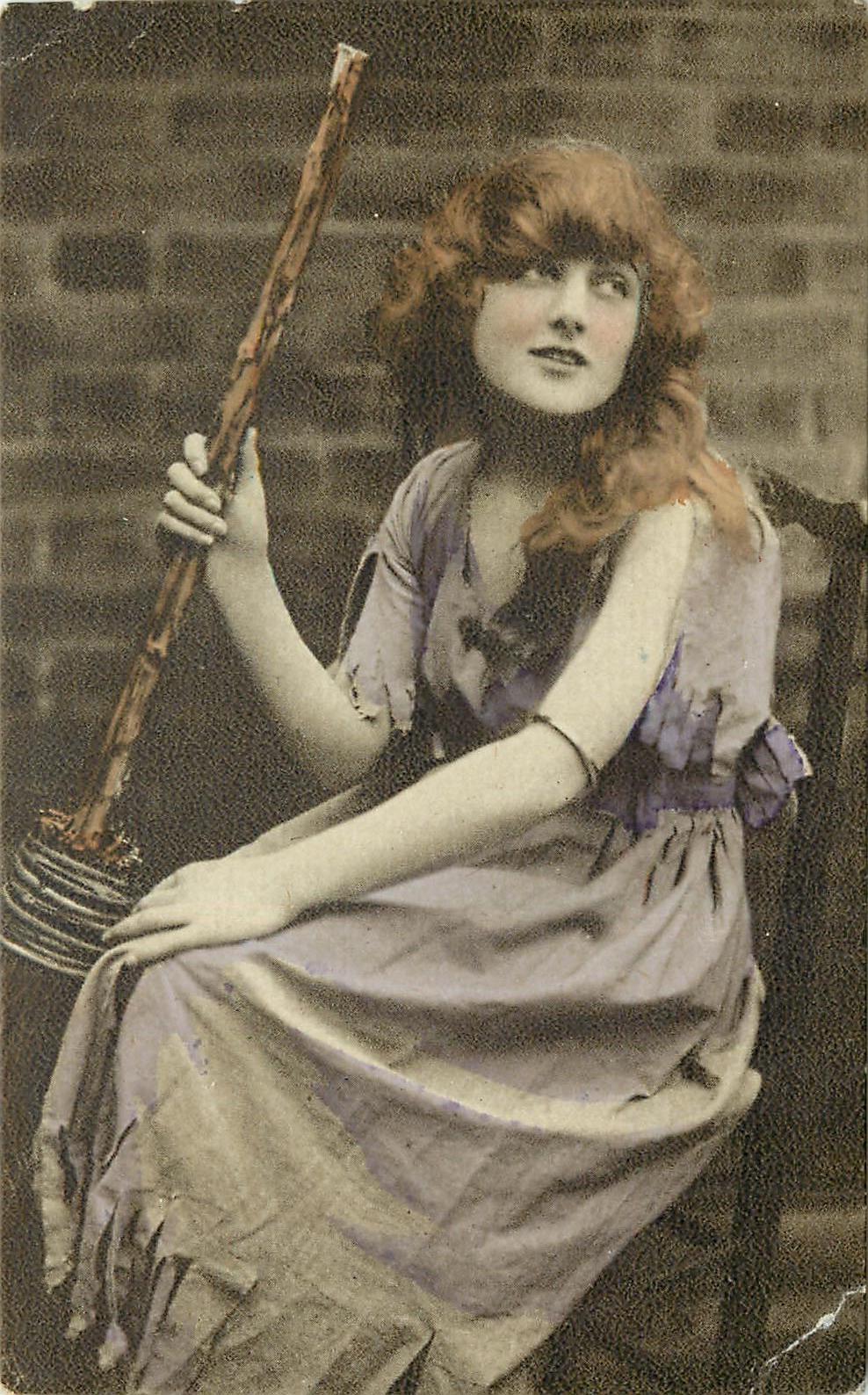 pretty woman sits on chair facing left, holds a broom with right hand, left hand rests on her knee