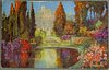 old castle in distance in centre, pond on foreground, stone pathway leading to castle