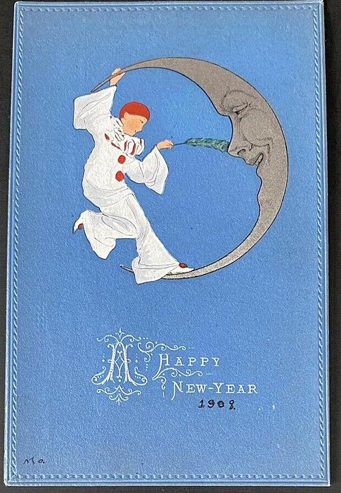 A HAPPY NEW YEAR boy dressed in whtie hangs from the tip of the moon and stands on the other tip
