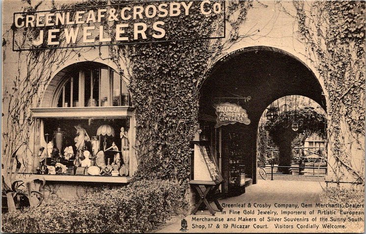 GREENLEAF & CROSBY COMPANY, GEM MERCHANTS, DEALERS IN FINE GOLD JEWELRY, INPORTERS OF ARTISTIC EUROPEAN MERCHANDIS AND MAKERS OF SILVER SOUVENIRS OF THE SUNNY SOUTH. SHOP 17 & 19 ALCAZAR COURT. VISITORS CORDIALLY WELCOM