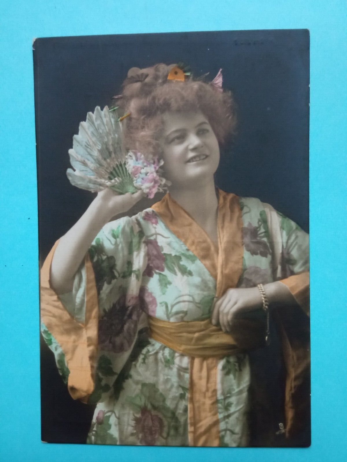 three quarter length study of girl dressed in kimono, holds a hand fan to right of her head, faces & looks to her left