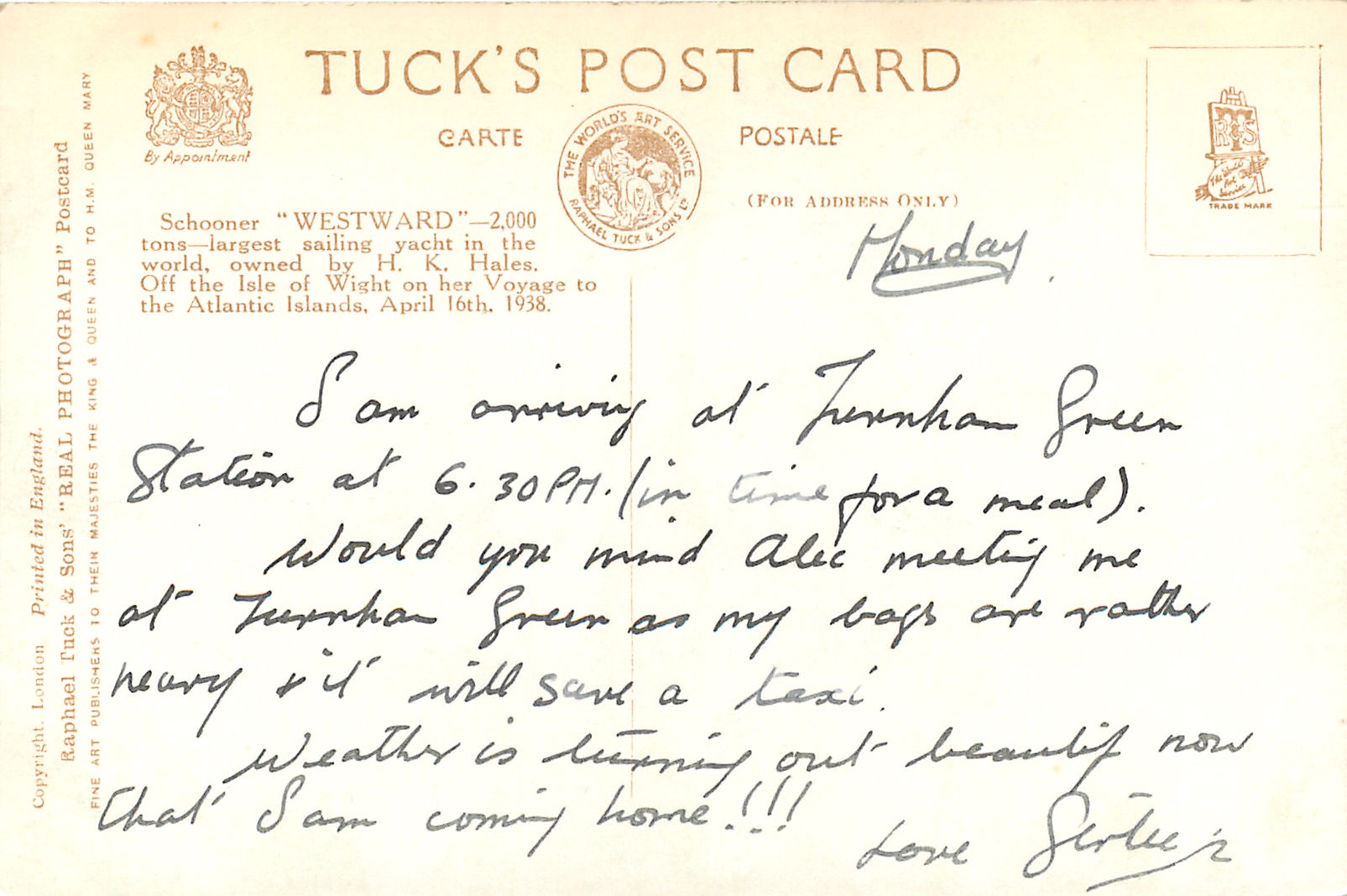 back information - SCHOONER "WESTWARD" - 2,000 TONS - LARGEST SAILING YACHT IN THE WORLD, OWNED BY H.K. HALES. OFF THE ISLE OF WIGHT ON HER VOYAGE TO THE ATLANTIC ISLANDS, APRIL 16TH, 1938. back information
