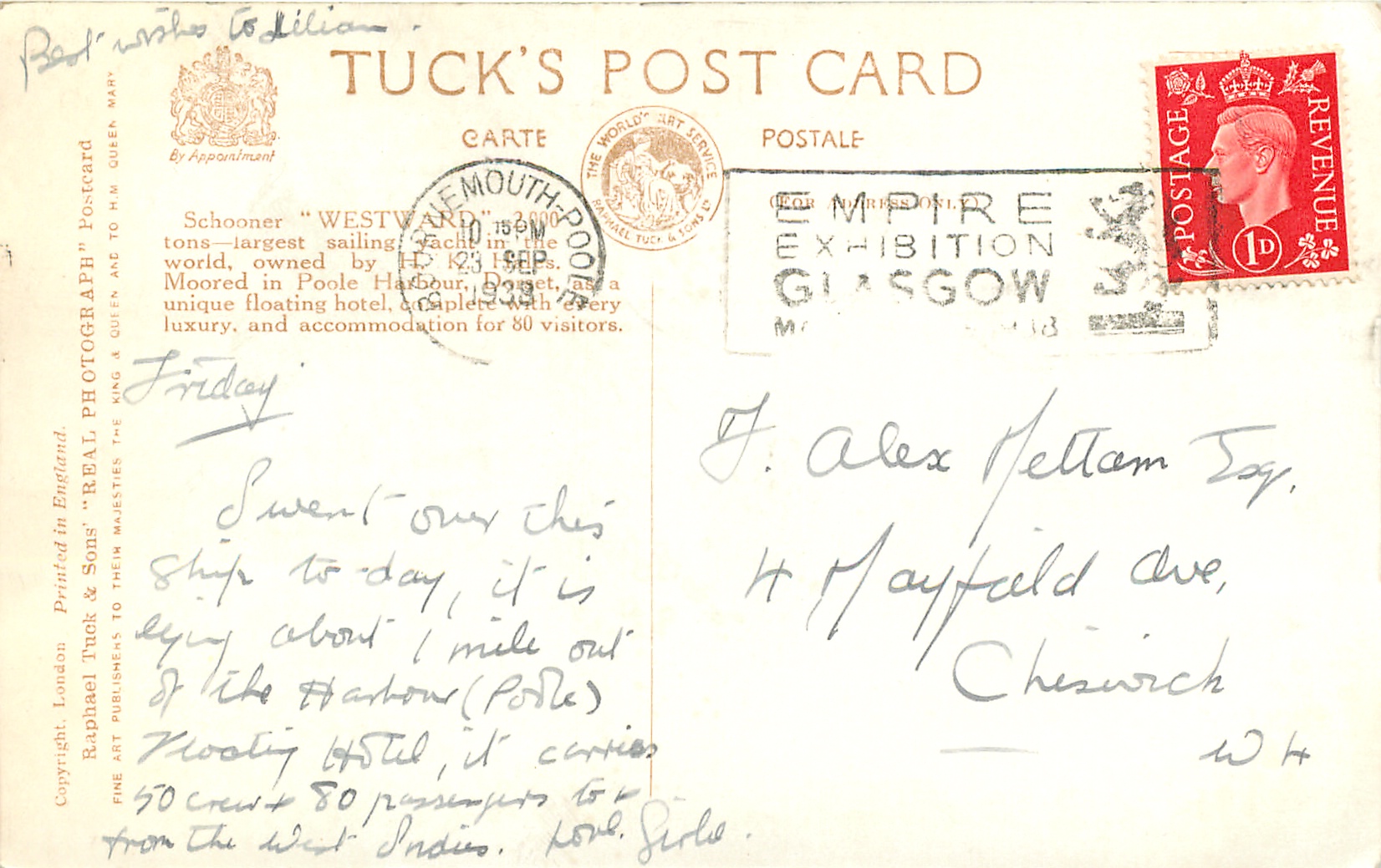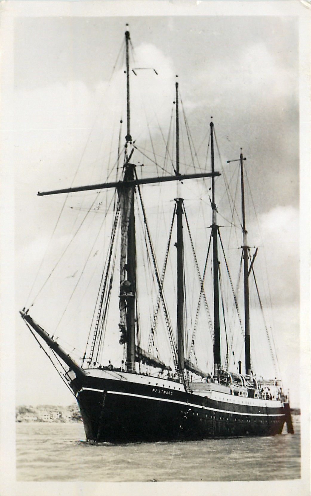 back information :- SCHOONER "WESTWARD" - 2,000 TONS - LARGEST SAILING YACHT IN THE WORLD, OWNED BY H.K. HALES. MOORED IN POOLE HARBOUR, DORSET, AS A UNIQUE FLOATING HOTEL, COMPLETE WITH EVERY LUXURY, AND ACCOMMODATION FOR 80 VISITORS.