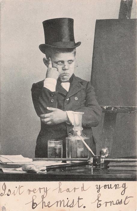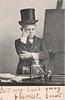 boy dressed in long coat and top hat with glasses, holds his right index finger to his temple