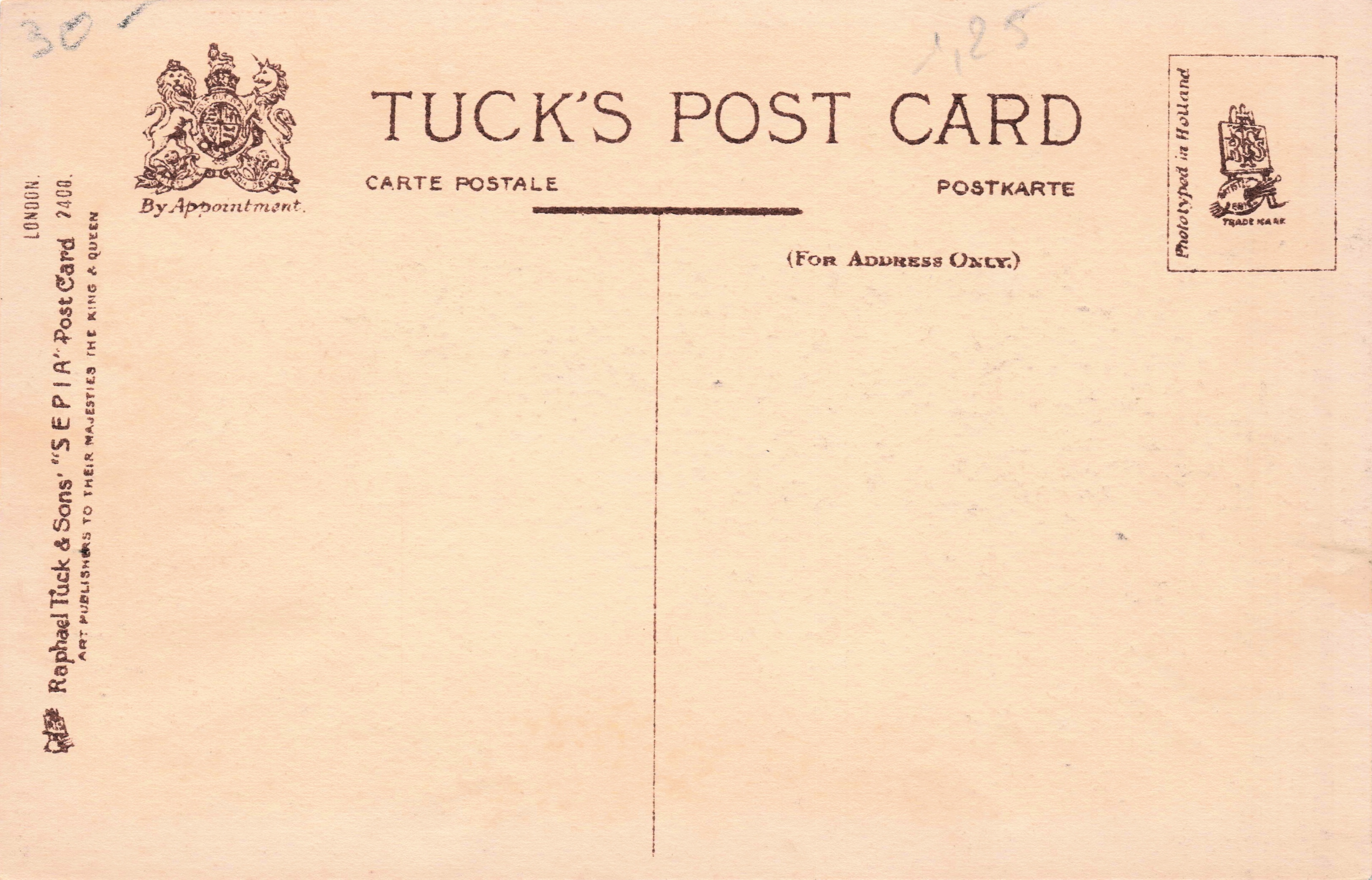shades of deep sepia, SEPIA, PROCESSED IN SAXONY or PHOTOTYPED IN HOLLAND (in stamp box), 3 backs, listed in 1911/1912 Postcard Catalogue