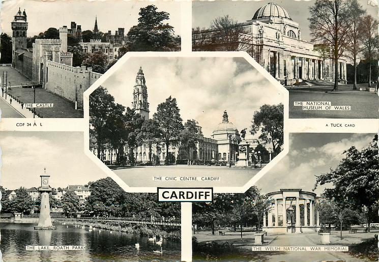 5 insets THE CASTLE/THE NATIONAL MUSEAUM OF WALES/THE CIVIC CENTRE, CARDIFF/THE LAKE ROATH PARK/THE WELSH NATIONAL WAR MEMORIAL