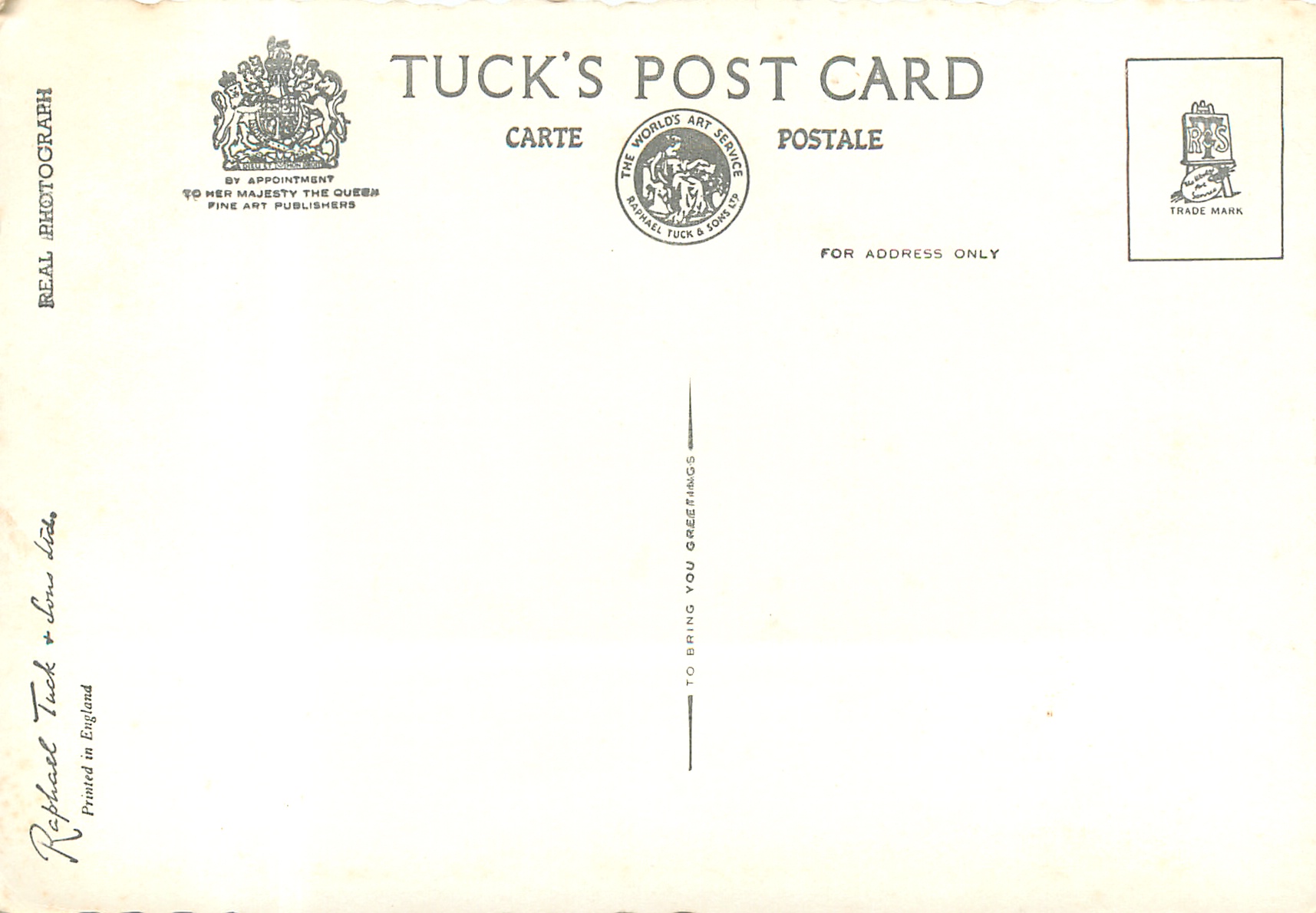 REAL PHOTOGRAPH, PRINTED IN ENGLAND, GREETINGS TO YOU or TO BRING YOU GREETINGS on back, scalloped edges.