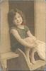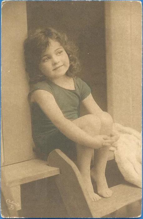 young girl in bathing costume sitting in door of bathing hut, hands joined around her knees