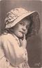 head & shoulders study of young curly haired girl with embroidered dress & hat, faces right, finger to her lips