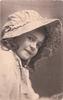 head & shoulders study of young curly haired girl with embroidered dress & hat, faces right, lips apart