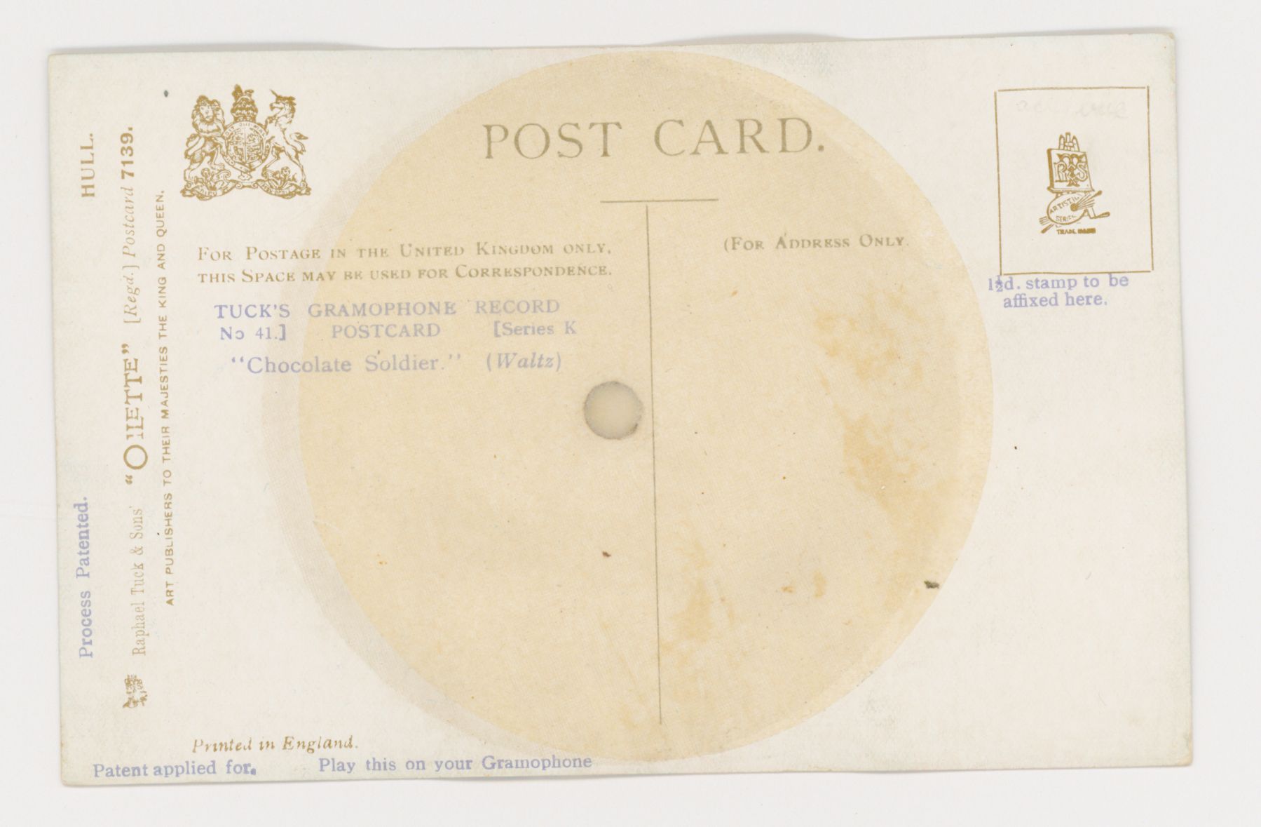 see packet images, each packet contained card giving information about POSTCARDS, each card overprinted on back in blue (3 styles) TUCK'S GRAMOPHONE RECORD POSTCARD with SERIES K, NO. & record title, PROCESS PATENTED left margin & PATENT APPLIED FOR PLAY THIS ON YOUR GRAMOPHONE on bottom of card, 1 1/2d. STAMP TO BE AFFIXED HERE beneath stamp box, cards to which the record was attached are usually taken at random. Cards are collected in the packets in which they were sold, estimate 30 dollars a packet of 4 cards.