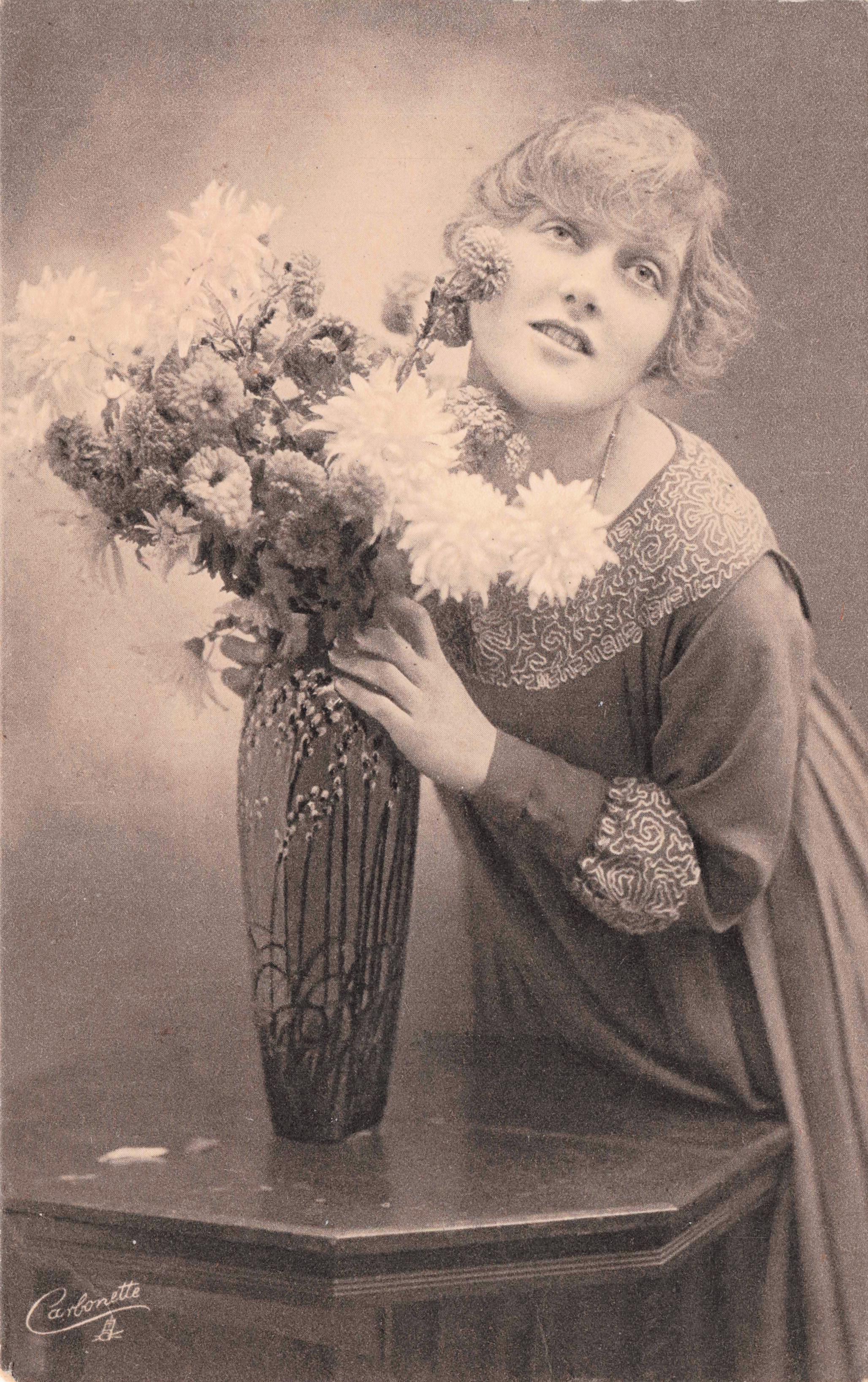 woman posed beside vase on the left, vase containing large bunch of flowers, holds vase with both hands