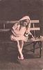 girl in lacy dress & bonnet sits on slatted wooden bench strewn with flowers, she sits on seat with legs crossed at ankles, left hand only on seat, right hand on lap, faces & looks front