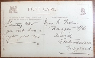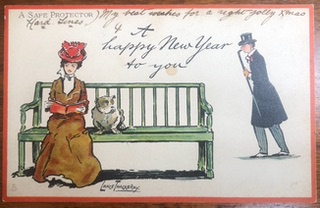 CHROMOGRAPHED IN SAXONY, orange borders, possibly listed in RAPHAEL TUCK & SONS' LD. CHRISTMAS & NEW YEAR 1904/1905 catalogue ("1799 LADY AND GENTLEMAN OUT DINING, ETC." pg. 101)