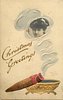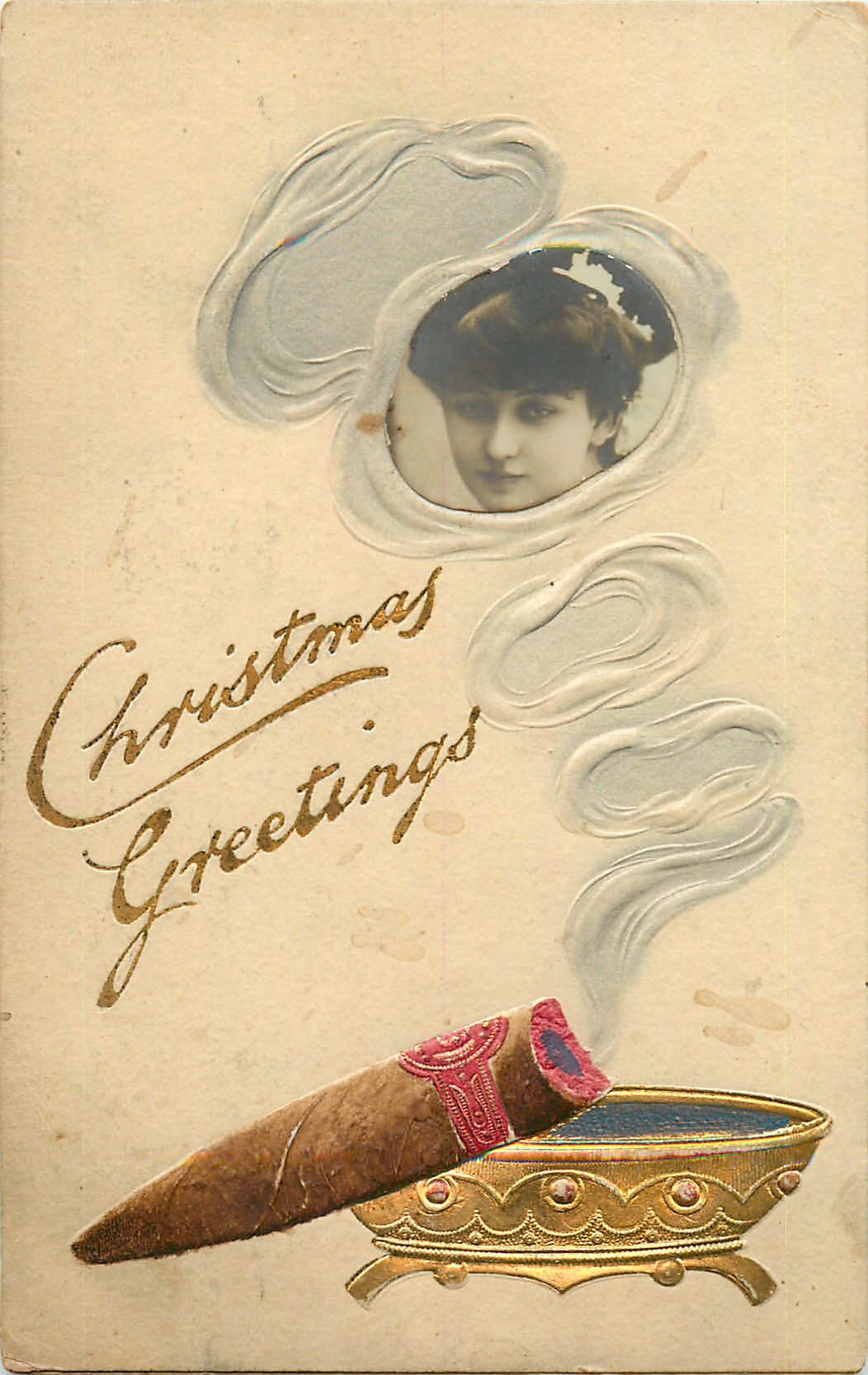 CHRISTMAS GREETINGS smoke from cigar surrounds photo-inset of girl looking left/front
